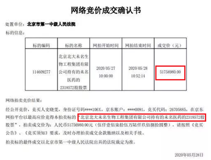 5月28日,据京东网络司法拍卖平台信息显示,未名医药的控股股东北京北大未名生物工程集团有限公司(以下简称“未名集团”)所持有的未名医药的2318572股无限售流通股已成功拍出,起拍价为3607.6万,保证金300万元,最终被自然人史晓雯拍得,成交价为5175.7万元。