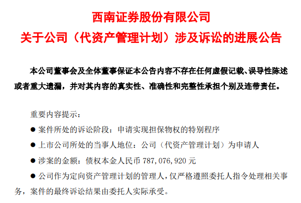 对于本次诉讼对西南证券偿债能力的影响,西南证券表示,公司作为该资管计划的管理人,仅严格遵照委托人指令处理相关事务,案件的最终诉讼结果由委托人实际承受。上述案件未对公司经营、财务状况及偿债能力造成影响,公司各项债券均按期足额付息兑付,未发生违约情况。