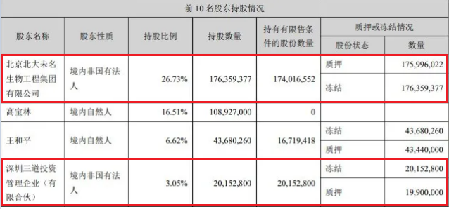 其中,未名集团持有股份 176,359,377股,占公司股份总数的 26.73%;深圳三道持有本公司股份 20,152,800 股,占公司股份总数的 3.05%,以上共计占公司股份总数29.78%的股权已被法院全部冻结,是其所持公司股份的 100%。