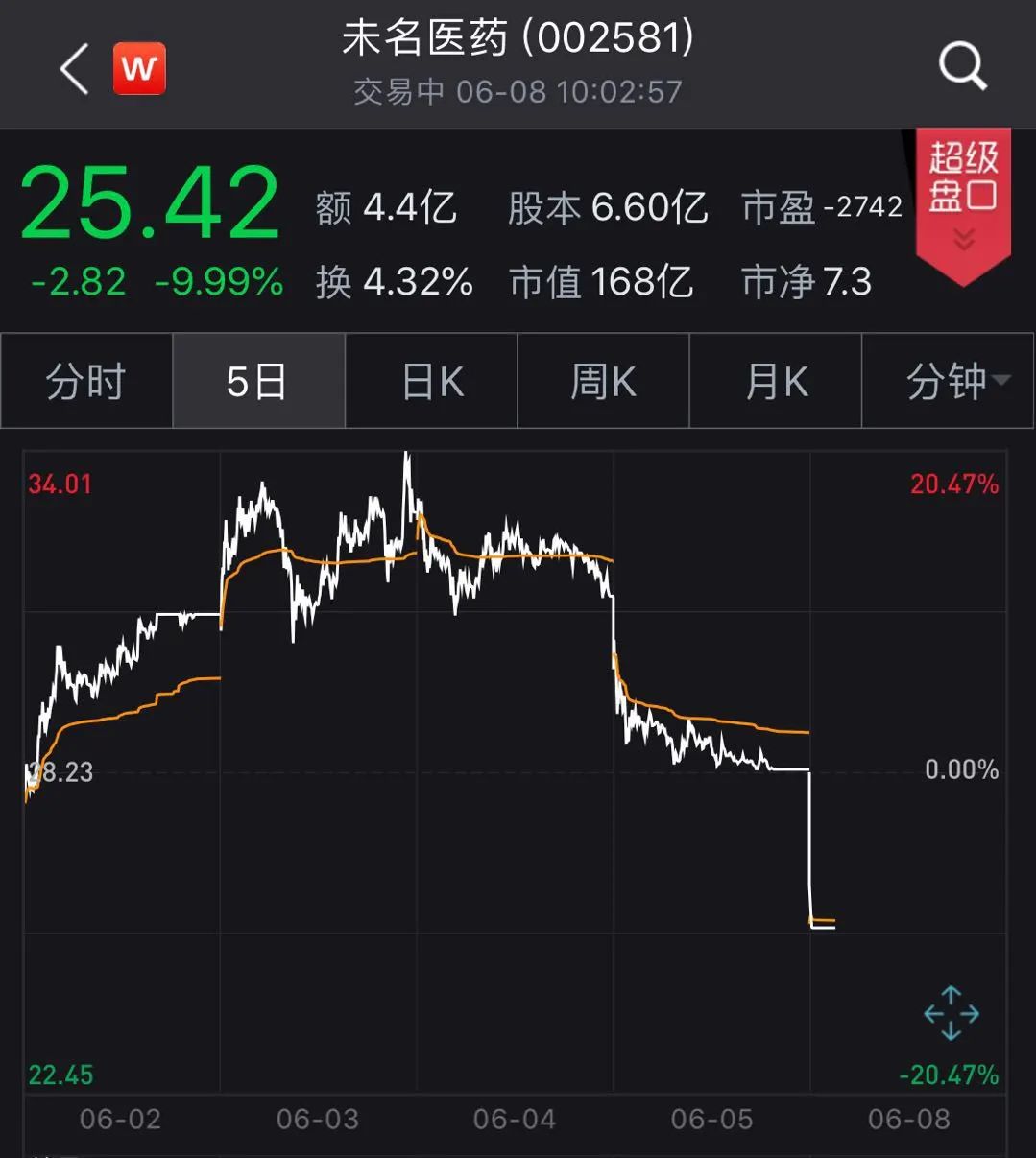 该消息对近期负面消息不断的未名医药来说无疑是雪上加霜。今日开盘后,未名医药(002581.SZ)再度跌停,股价较6月3日盘中最高价34.10元/股已跌超25%,市值缩水超50亿元。