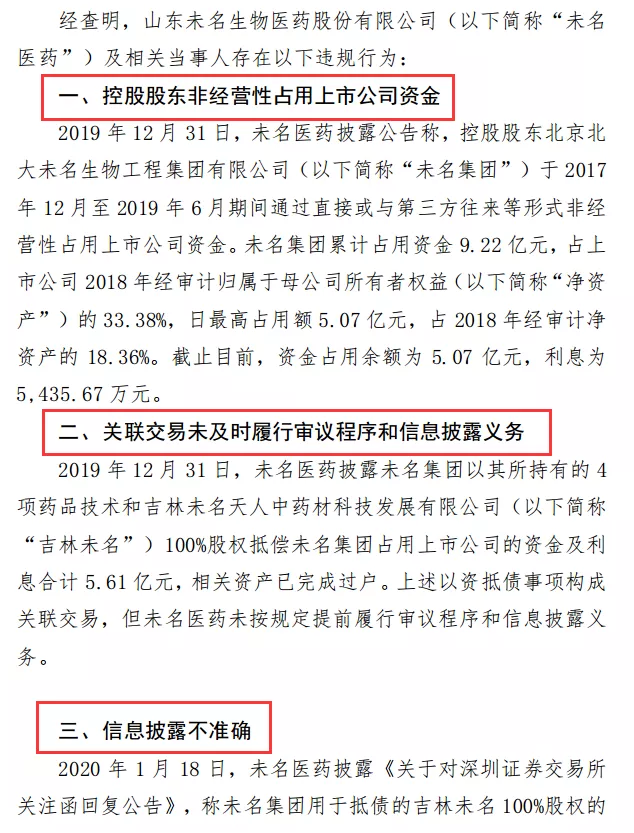 事情起因是,2017年12月,未名医药开始发生非经营性资金占用的问题。截至2019年12月31日,未名医药则公告,实际被控股股东占用的资金发生额为人民币9.22亿元,已偿还4.15亿元,资金占用余额为5.07亿元,利息高达5435.67万元。