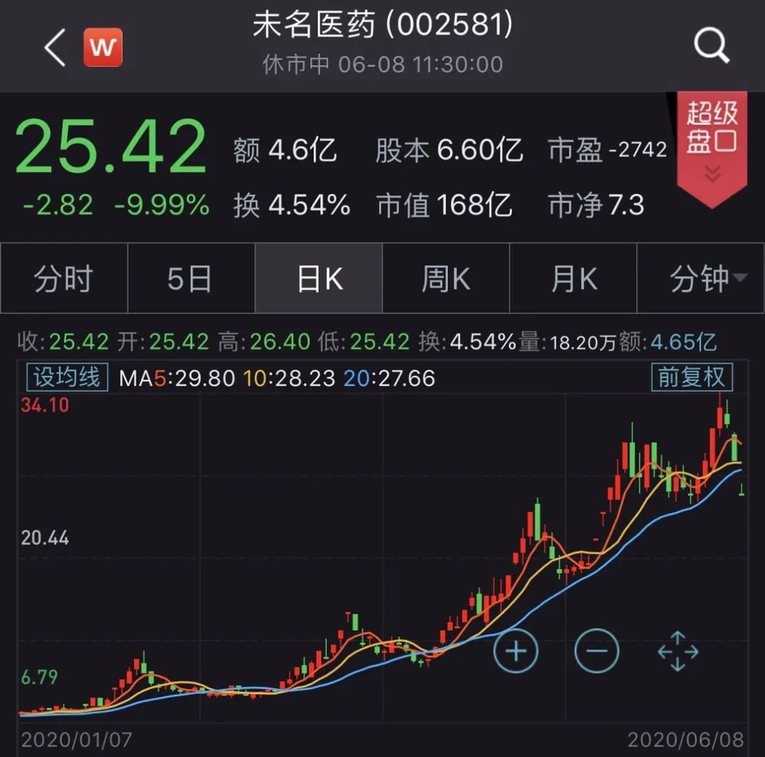 去年年底,未名医药股价在2019年最后个交易日停在了6.58元,而仅仅半年时间,公司就一路上涨至最高点34.10元,区间最高涨幅近400%。虽然近两日股价有所下滑,但截至6月8日25.42元/股的价格,公司年初至今仍实现了251.1%的涨幅。