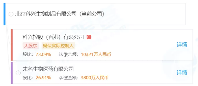 天眼查显示,北京科兴生物制品有限公司股东为科兴控股(香港)和未名生物医药有限公司,持股比例分别为73.09%和26.91%,未名生物医药有限公司则是未名医药全资子公司。