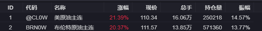 消息方面,美原油主连与布伦特原油主连单日涨幅均超20%,分别报110.34美元/桶、111.57美元/桶,逼近关键心理关口,
