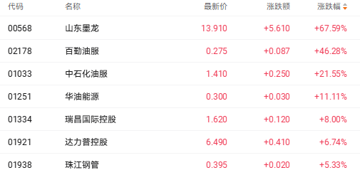 值得注意的是,与油气息息相关的设备股也出现上涨。截至发稿,山东墨龙(00568.HK)涨67.59%、百勤油服(02178.HK)涨46.28%、中石化油服(01033.HK)涨21.55%。