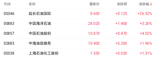 其中港股能源板块全线飙升,石油和煤炭股走强。截至发稿,延长石油国际(00346.HK)涨26.32%、中国海洋石油(00883.HK)涨5.33%、中国石油股份(00857.HK)涨4.42%、