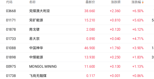 截至发稿,兖煤澳大利亚(03668.HK)涨6.50%、兖矿能源(01171.HK)涨5.63%、中煤能源(01898.HK)涨1.83%。