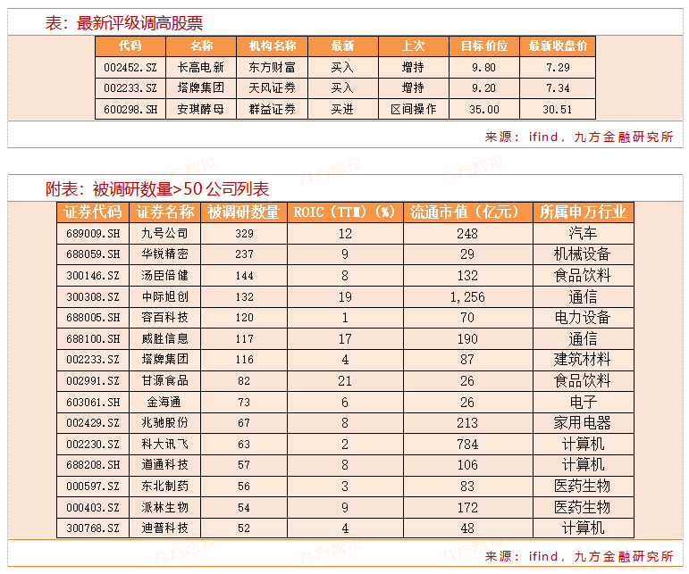 近5日有19家公司获得券商调高评级,长高电新、塔牌集团、安琪酵母获证券给出明确目标价格。