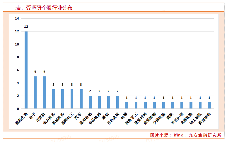 从行业分布来看,本期医药生物行业调研量居首,有12家上市公司接受调研;随后为电子、计算机行业,均有5家上市公司接受调研。