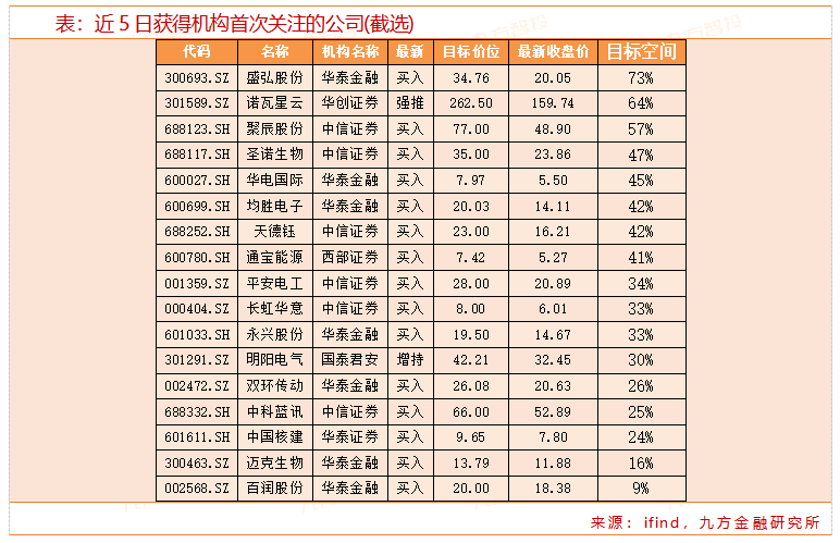 最新机构首次关注股票方面,近5日共有52份研报对上市公司进行首次覆盖,其中,17家获得明确的目标价格。