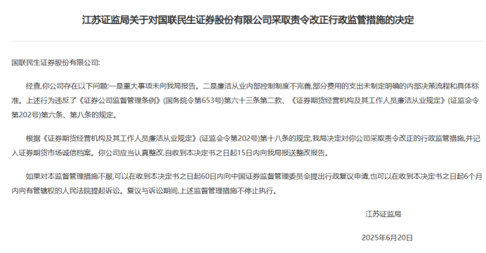 江苏证监局对国联民生证券采取责令改正行政监管措施。