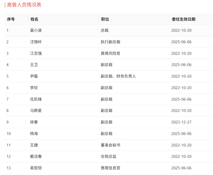 6月6日,国联民生证券公告了新增高管情况,最新聘任汪锦岭担任公司执行副总裁,聘任王卫、任凯锋、杨海担任公司副总裁,聘任吴哲锐担任公司首席信息官等。根据公司官网,截至目前,国联民生证券高管团队共13人,包括董事长兼总裁葛小波、执行副总裁汪锦岭、7名副总裁(李钦、马群星、尹磊、徐春、王卫、任凯锋、杨海),以及董事会秘书王捷、合规总监戴洁春、首席风险官江志强、首席信息官吴哲锐。