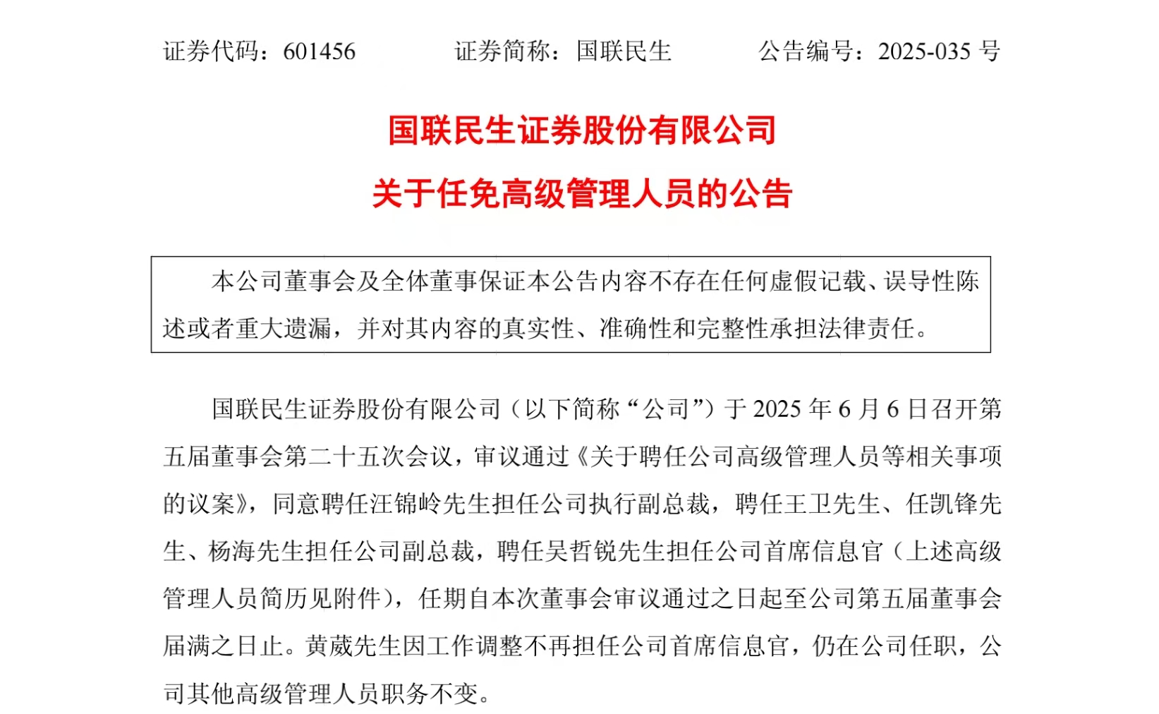 国联民生证券新任四位副总裁强化战略执行,聘任首席信息官强化数字化战略。