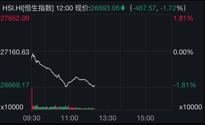 据Wind数据,1月30日早盘,港股三大指数小幅低开后持续下挫,盘中小幅回升后又回落。截至午间收盘,恒生指数跌467.57点,报26693.06点,跌幅为1.72%,失守27000点关口;恒生中国企业指数跌1.79%,报10428.74点;恒生香港中资企业指数跌2.40%,报4178.63点。