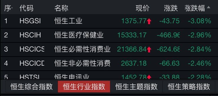 恒生十二个行业板块全线尽墨。其中,工业、医疗保健、必需性消费板块跌幅居前。