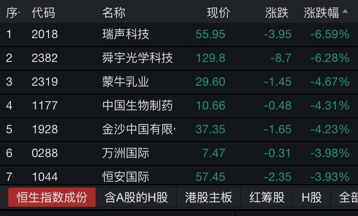 蓝筹股悉数下跌,手机设备股跌幅居前,瑞声科技、舜宇光学科技午盘均跌逾6%,携手领跌蓝筹。