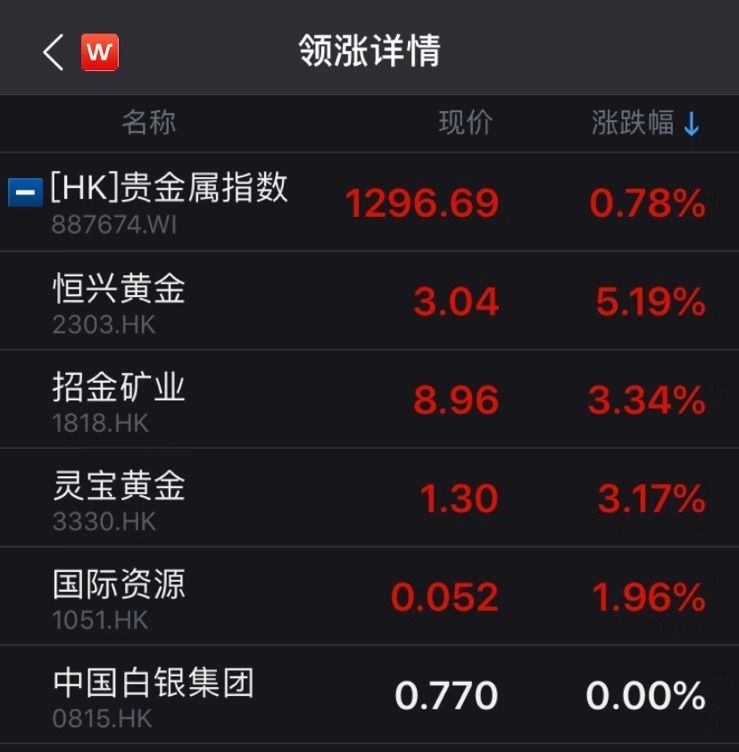 此外,从细分板块看,具有避险属性的贵金属板块逆市上涨,恒兴黄金午盘涨逾5%,招金矿业、灵宝黄金午盘均涨逾3%。