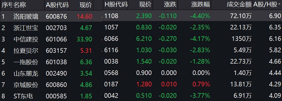 Wind数据显示,1月30日统计的119只上市交易的“A+H”股,其A股股价目前均全部高于H股价格,且A股较H股溢价率普遍高企。A股较H股比值超过3的即有15只,AH股溢价率最高的为洛阳玻璃、浙江世宝和中信建投,其A股较H股的比值分别为6.9、6.35、6.16。