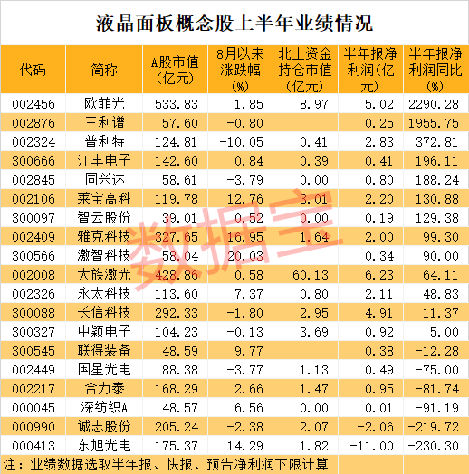 从业绩数据来看,京东方A与TCL科技目前均未公布半年报情况。在已经公布半年报、快报、预告净利润下限的公司中,有7家公司上半年净利润有望翻倍增长,分别是欧菲光、三利谱、普利特、江丰电子、同兴达、莱宝高科、智云股份。欧菲光净利润增幅最高,公司上半年实现盈利5.02亿元,同比增长22.9倍。不过自公布业绩以来,欧菲光走势较为平淡,与年内高点相比,回调幅度在15%以上。