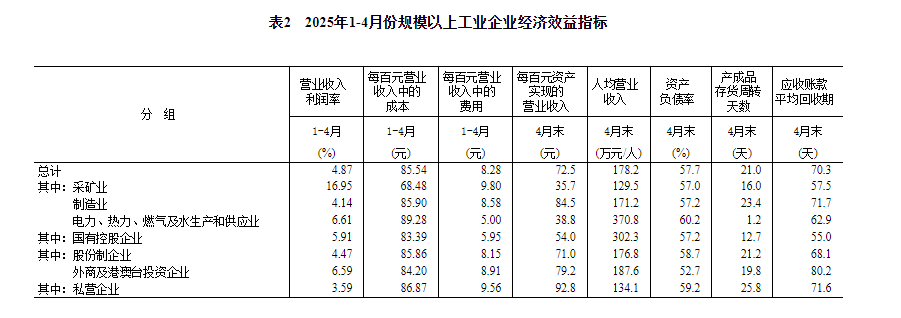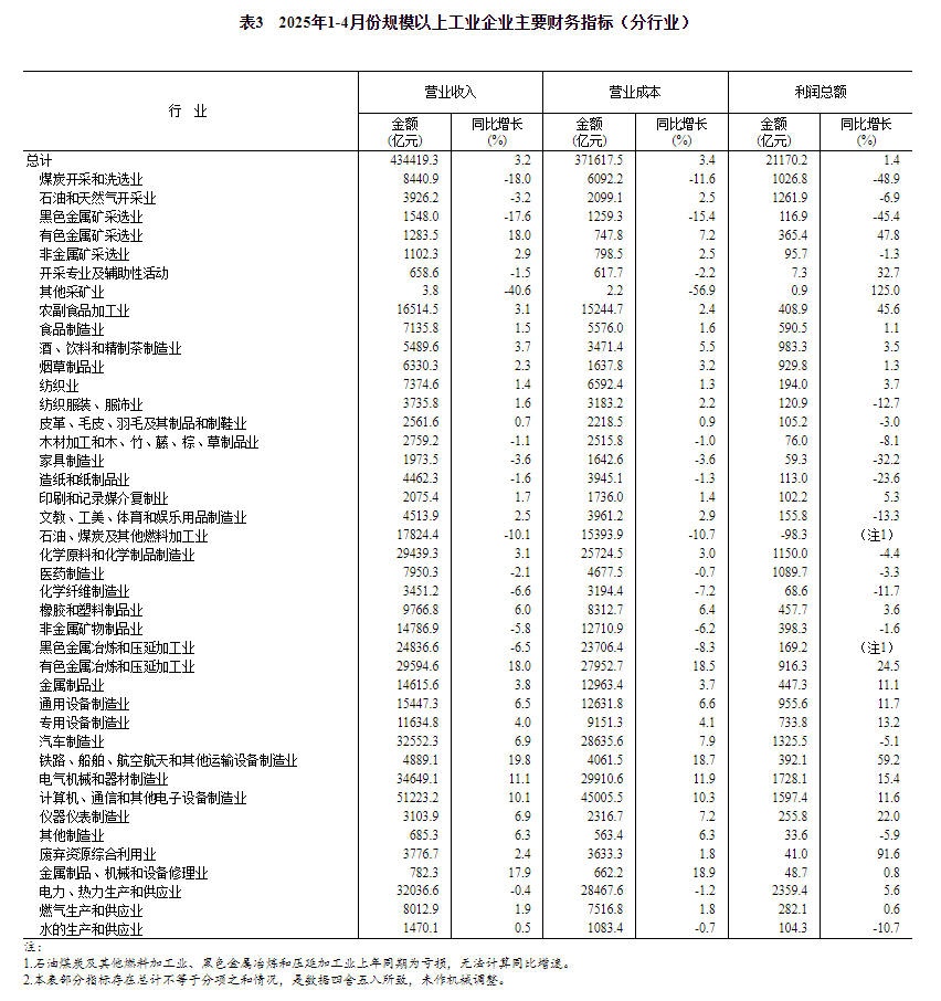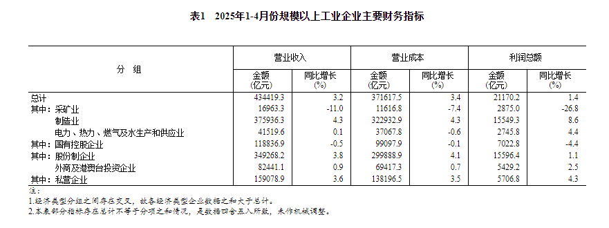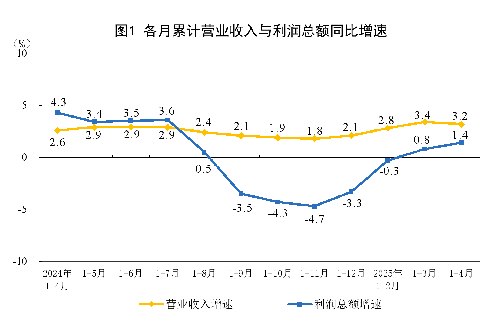 2025年1—4月份全国规模以上工业企业利润增长1.4%