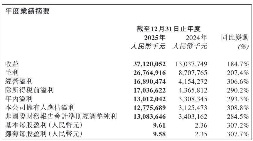 2025年为泡泡玛特成立十五周年,全年实现收入人民币371.20亿元,同比大幅增长184.7%;实现净利润127.76亿元,同比增长308.8%。基本每股盈利人民币9.61元,同比增长307.2%,摊薄每股盈利人民币9.58元,同比增长307.7%。