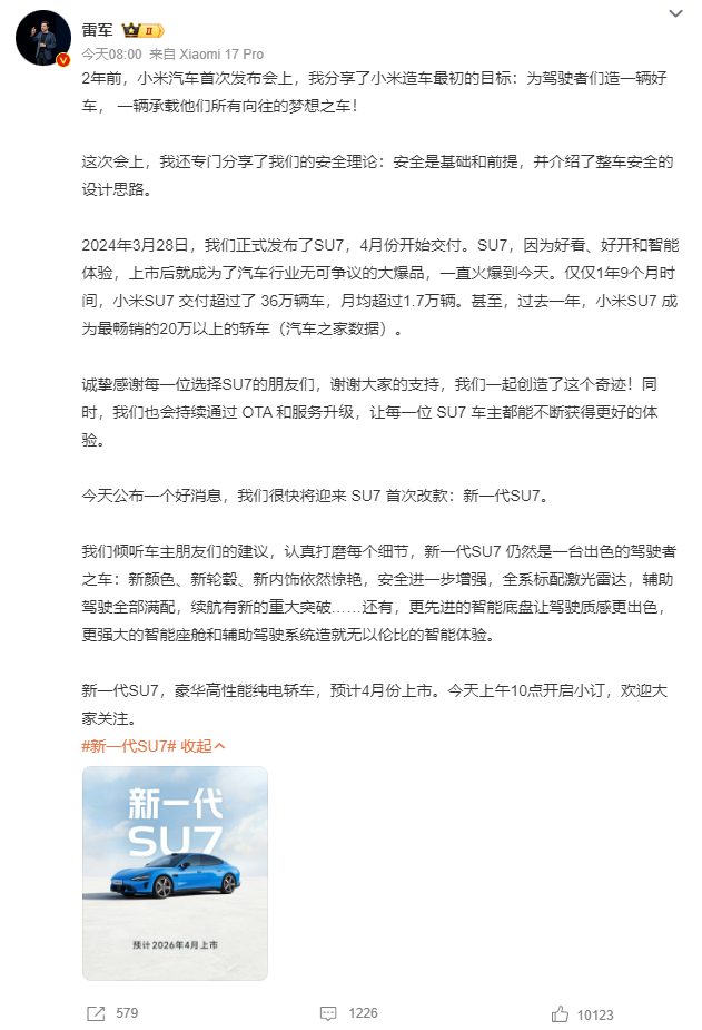 雷军官宣!新一代SU7预计4月份上市 续航有新的重大突破!