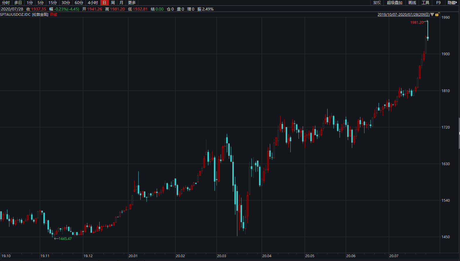 周二,伦敦现货黄金在一边倒的看多声音中继续走高,一度登上1980美元/盎司的高位,距离2000 美元只有一步之遥。机构纷纷给出下一步目标价,从3000美元到4000美元不等,更有甚至看到1万美元。但其中也不乏警告声,认为黄金无止境的上涨是痴心妄想。