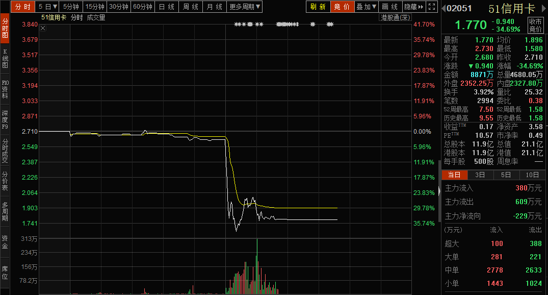 10月21日,去年港股上市的国内信用卡管理龙头51信用卡,总部突然被传调查。51信用卡股价盘中闪崩,一度跌逾40%,下午1点50分,51信用卡发布暂停买卖公告,截至发稿,51信用卡报价1.77港元/股,下跌34.69%。