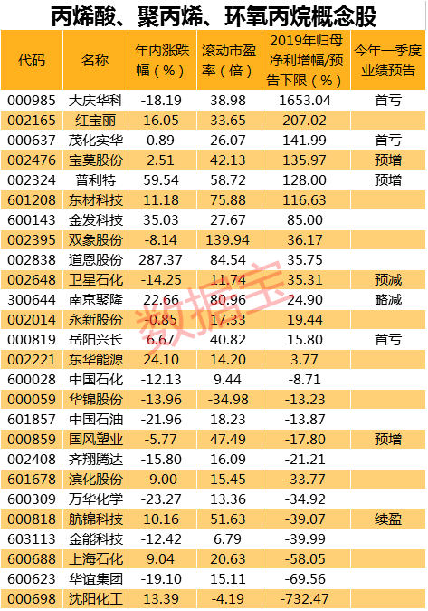 生产丙烯酸的上市公司有沈阳化工、双象股份、卫星石化、华谊集团等。生产聚丙烯的上市公司有中国石化、中国石油、东华能源、东材科技等。生产环氧丙烷的上市公司有红宝丽、航锦科技、滨化股份、石大胜华等。