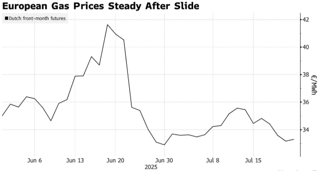 欧洲天然气价格在连续下跌三天后有所企稳,交易员们正在评估全球各地的天然气需求情况,这些需求可能会对欧洲大规模储备天然气的努力构成挑战。周二,基准期货价格在 33 欧元/兆瓦时附近波动,此前一交易日曾创下三周以来的新低。