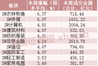 从板块来看,本周农林牧渔、传媒板块表现最为活跃,全周涨幅均超过6%;计算机、建筑材料、纺织服装、非银金融等板块涨幅也均在4%以上。