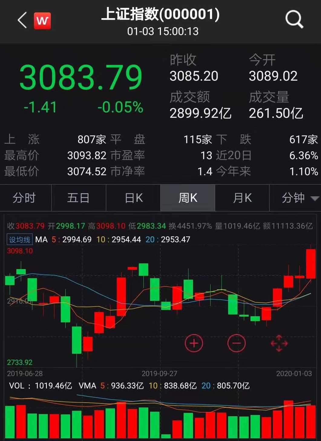 前半周两个交易日,沪指连续上攻最终收于3050.12点,为2019年画上圆满句号。周四沪指跳空高开,全天大涨1.15%,实现2020年开门红;尽管周五微跌,但截至收盘,沪指报3083.79点,全周累计上涨2.62%,周线实现五连阳。