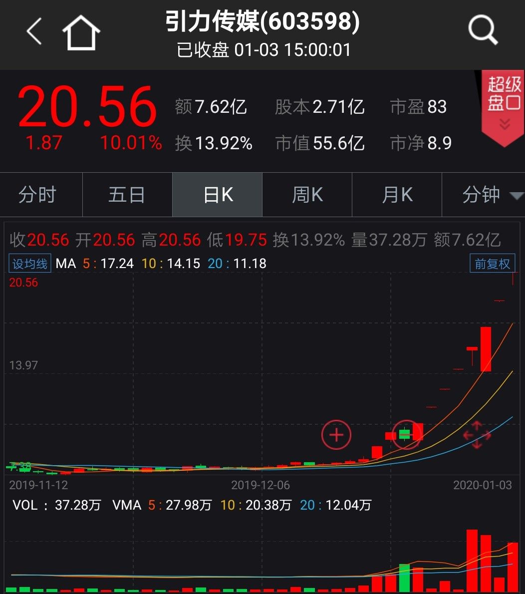 本周部分热门股“高温”不退。星期六在经历周一的小幅下跌后,随后三个交易日再度连续涨停,最近15个交易日收出12个涨停;引力传媒上周(2019年12月23日至2019年12月27日)五个交易日斩获四个涨停板,本周4个交易日再度收获三涨停。