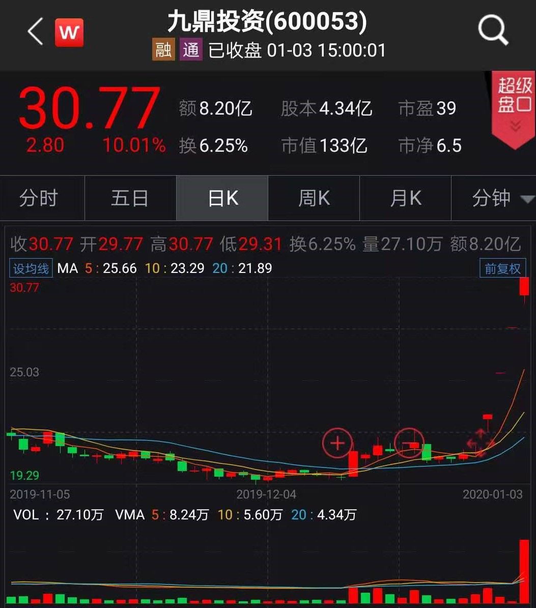 本周涨势最猛的非九鼎投资莫属。该股本周四个交易全部涨停,累计涨幅46.38%。