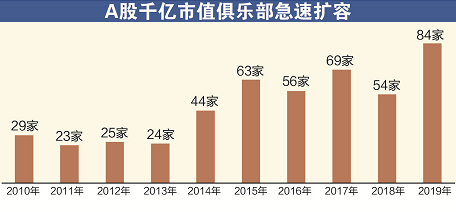 2019年A股千亿市值俱乐部急速扩容。证券时报·数据宝统计显示,2019年末跻身千亿市值俱乐部的A股公司达到84家,同比增长57%,逼近2015年5178点时千亿市值公司的数量(89家)。工商银行以近1.6万亿元的A股总市值蝉联市值榜首,贵州茅台市值年内突破万亿大关,成为万亿市值俱乐部新成员。