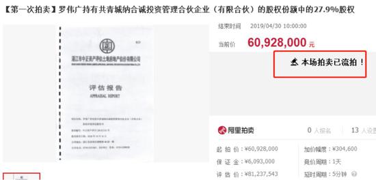 其实,今年4月底,罗伟广持有共青城纳合诚投资管理合伙企业(有限合伙)的部分股权也被司法拍卖,但是最终出现“无人接盘”的尴尬境地,“流拍”收场。