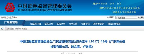 广东证监局责令新价值投资改正,给予警告,并处以190万元罚款。对直接负责的主管人员钱文彦给予警告,并处以10万元罚款,对其他直接责任人员卢冬妮给予警告,并处以5万元罚款。