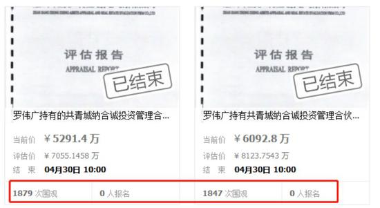 具体来看,是罗伟广持有的共青城纳合诚投资管理合伙企业(有限合伙)股权份额中的24.23%股权、27.9%股权,评估价分别为7055.15万元、8123.75万元,起拍价分别为5291.4万元、6092.8万元。两笔拍卖合计市场价值评估值约1.51亿元,虽然折价25%,起拍价1.14亿元,但其拍卖仍然遇冷。