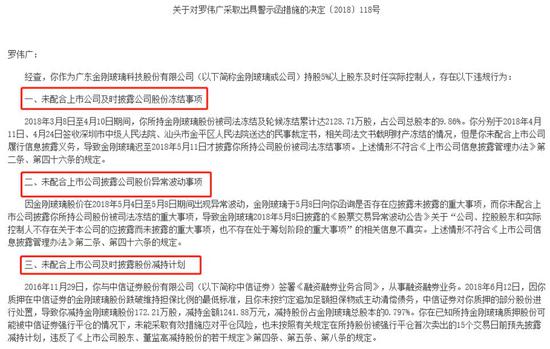 2018年12月,广东证监局发布行政监管措施决定书〔2018〕115号、116、117、118号,分别对金刚玻璃、及公司第一大股东拉萨市金刚玻璃实业有限公司、实际控制人罗伟广等责任人作出行政处罚,对罗伟广采取出具警示函措施。