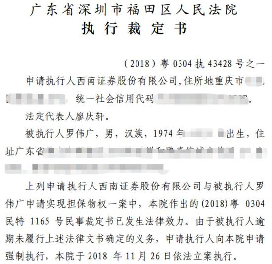 基金君从福田法院的一份执行裁定书里,也看到了罗伟广持股被拍卖的原因,主要是股权质押出了问题。执行裁定书表示,法院对西南证券与罗伟广申请实现担保物权一案作出裁定,由于罗伟广逾期未履行义务,西南证券申请强制执行,法院轮候冻结罗伟广持有的金刚玻璃股票,通过司法拍卖所得款来清偿本案债务。