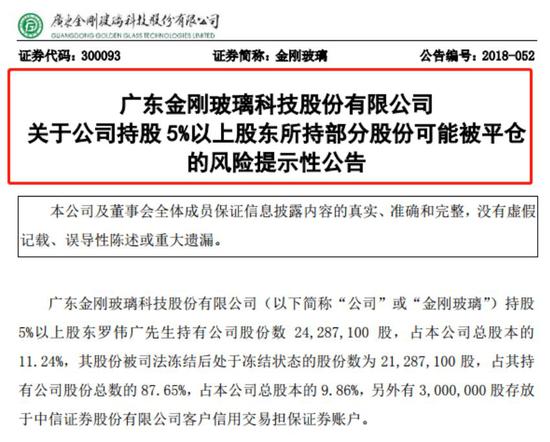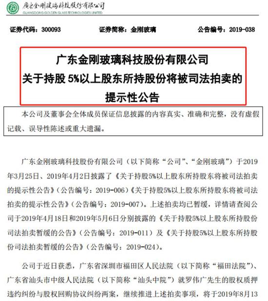 其实,关于这次拍卖,金刚玻璃在1个月前就有提示公告,交代了关于第二大股东罗伟广持股被拍卖的基本情况。