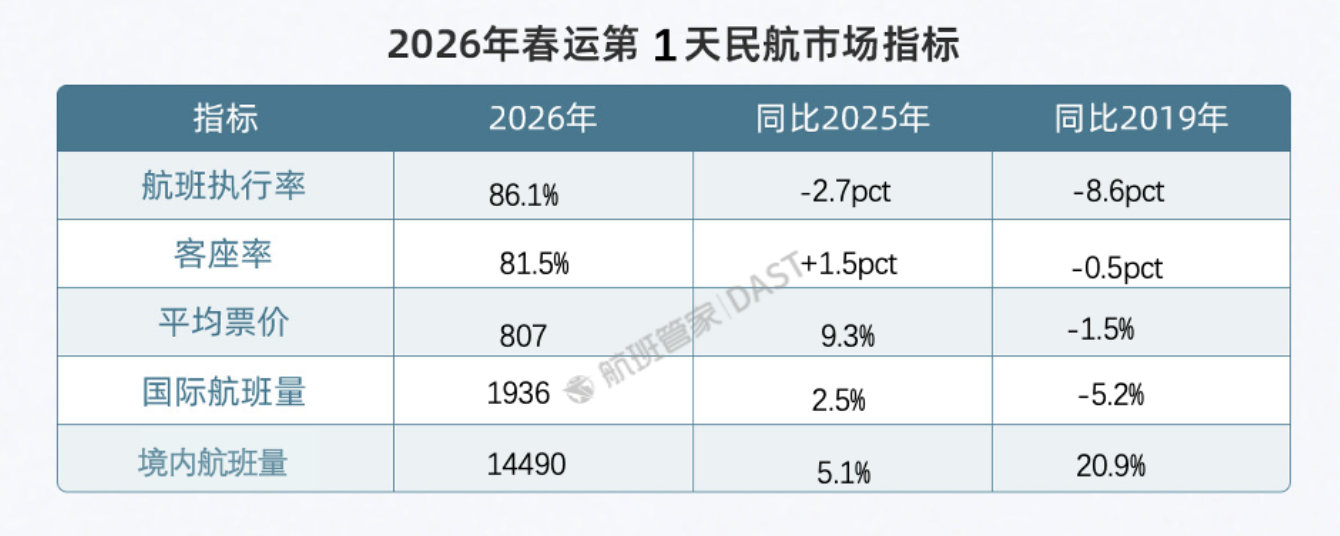 从春运第一天的数据来看,交通运输部的数据显示,民航客运量219万人次,比2025年同期增长5.3%。航班管家的票价监测数据披露,春运第一天的国内经济舱含税票价为807元,同比大增9.3%,不过比疫情前的2019年同期微降1.5%。