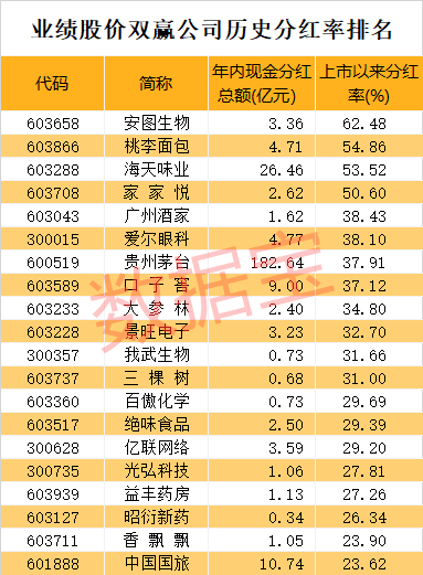 而从历史分红数据来看,有接近97%的公司上市以来分红率在10%以上。4家公司上市以来分红率超过50%,分别是安图生物、桃李面包、海天味业、家家悦。分红率最高的是安图生物,其上市以来分红率高达62.48%。(数据宝 梁谦刚)