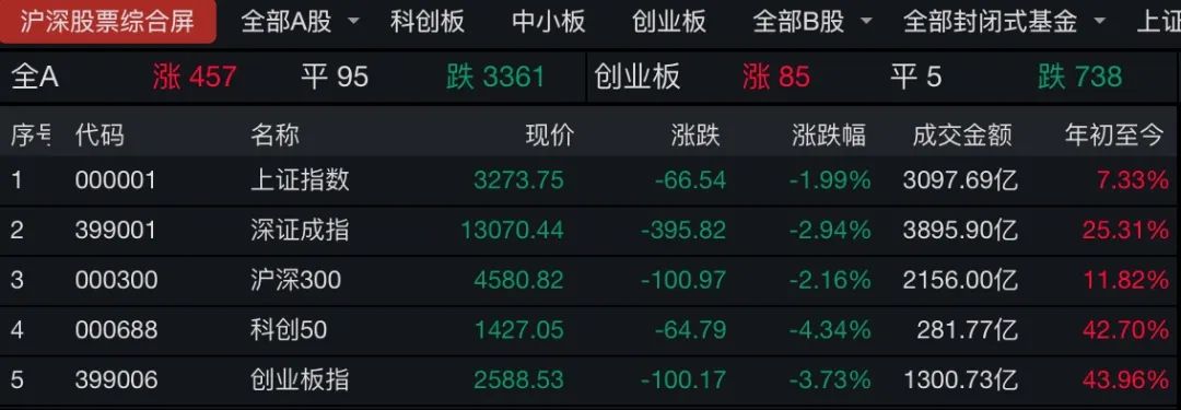 据Wind数据,截至8月12日午间收盘,上证指数跌1.99%至3273.75点,失守3300点关口;深证成指、创业板指分别跌2.94%、3.73%;3361只个股下跌,仅有457只个股上涨。