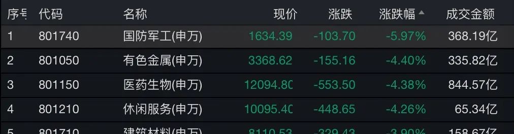 盘面上,前期热门的国防军工、有色金属板块跌幅居前。截至午间收盘,国防军工、有色金属行业指数分别跌5.97%、4.40%。