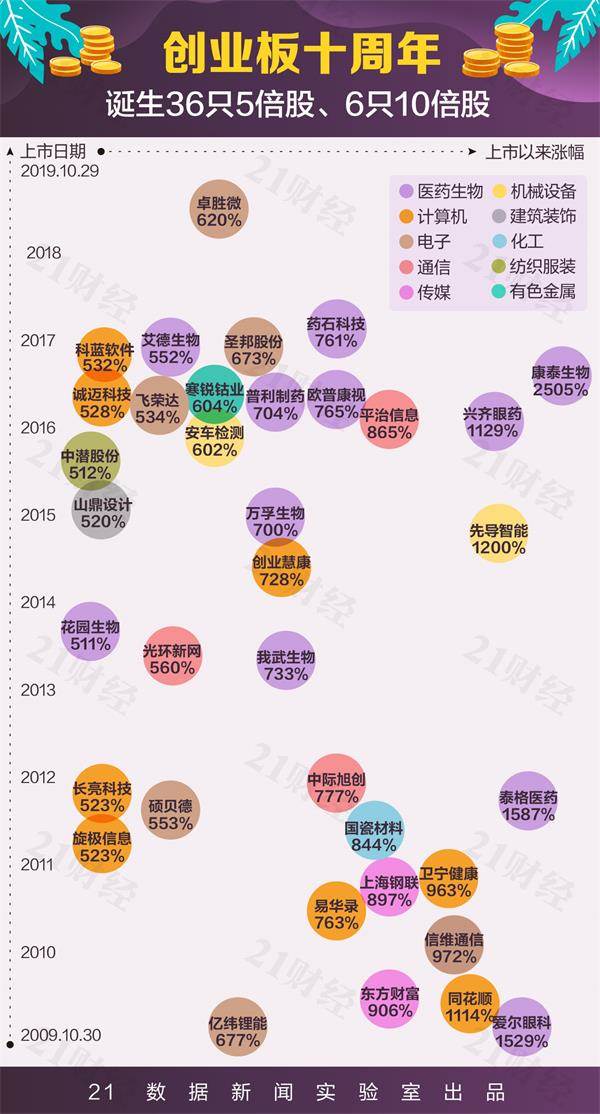 据21数据新闻实验室统计,截至2019年10月29日,共有6家创业板公司上市以来涨幅超过10倍,36家涨幅超过5倍。