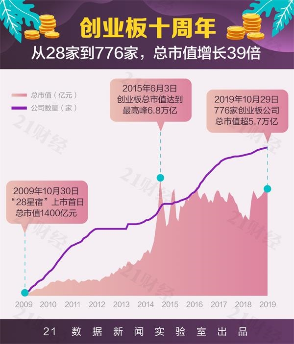 据21数据新闻实验室统计,目前创业板公司合计776家,占A股全部上市公司的21%,总市值5.71万亿元,相比十年前的1400亿元增长39倍。