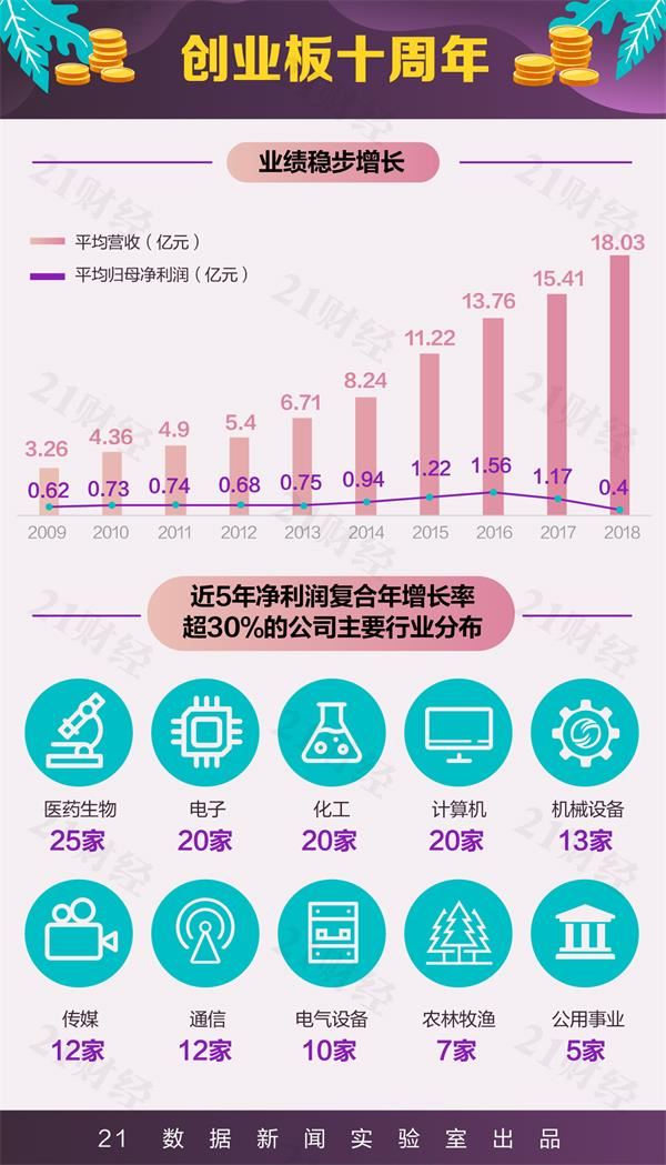 整体来看,高科技、高成长性依然明显。据21数据新闻实验室统计,有14家公司近5年净利润复合年增长率超过100%,而在这一数据超过30%的170家创业板公司中,医药生物、电子、化工、计算机四大行业占据半壁江山,这些行业也是市值、牛股TOP榜单的聚集地。创业板正从讲故事、炒概念慢慢回归业绩为王,依靠内生增长才能走的长远。