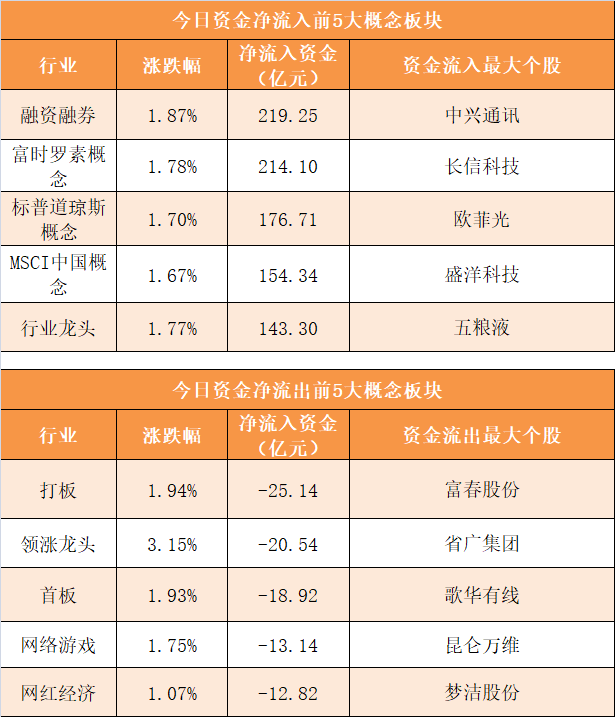 概念板块方面,今日融资融券、富时罗素概念、标普道琼斯概念、MSCI中国等概念板块资金呈现净流入,其中融资融券概念净流入219.25亿元居首。