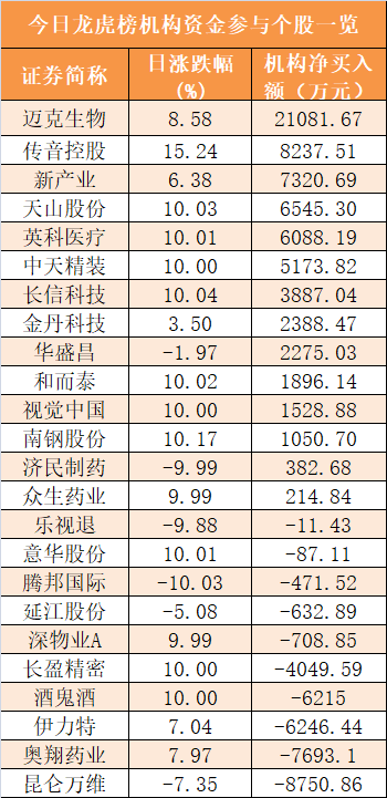 盘后龙虎榜数据显示,机构现身24股,其中迈克生物等14股呈现机构资金净买入,昆仑万维等10股呈现机构资金净卖出。